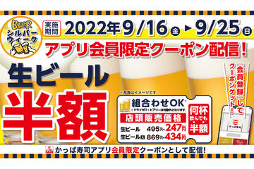 かっぱ寿司、「生ビール半額クーポン」シルバーウィークにアプリ会員限定配信