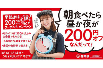 吉野家、朝食べると昼食か夕食が200円引きになる「朝活クーポンキャンペーン」