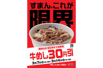 松屋、大阪/兵庫132店で「牛めし」が30円引きの「関西出店30周年大感謝祭」