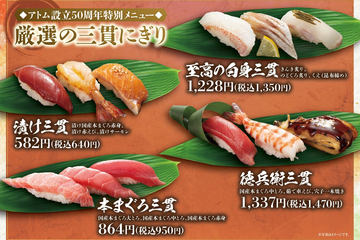 にぎりの徳兵衛、高級ネタが勢ぞろいの「厳選の三貫にぎり」。国産本まぐろや至高の白身を堪能