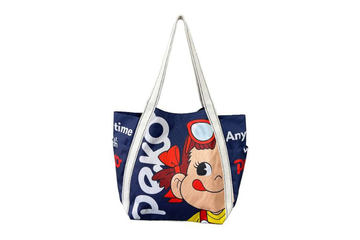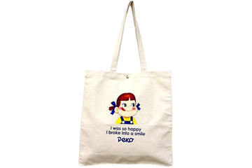 不二家“ペコちゃん”をデザインしたキャンバス生地のトートバッグ