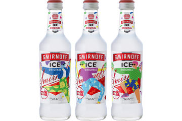 3本並べるとカンパイシーンになる、スミノフアイス2021年夏限定デザインボトル