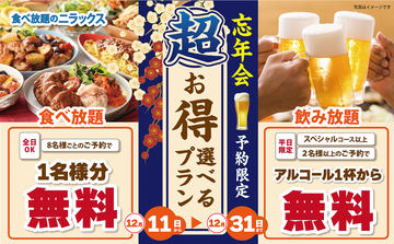 ニラックスブッフェ“食べ放題1名無料”か“飲み放題無料”の「忘年会プラン」