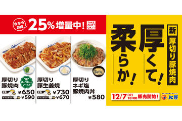 松屋、「厚切り豚焼肉」「厚切り豚生姜焼」「厚切りネギ塩豚焼肉丼」の肉を25%増量するキャンペーン