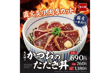 なか卯、直火で炙った肉厚なかつおを贅沢に使った「かつおのたたき丼」発売