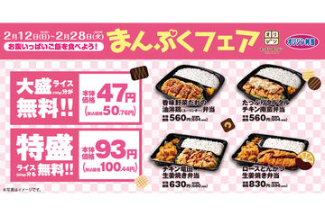 オリジン弁当/キッチンオリジン、ライス大盛・特盛分が無料の「まんぷくフェア」