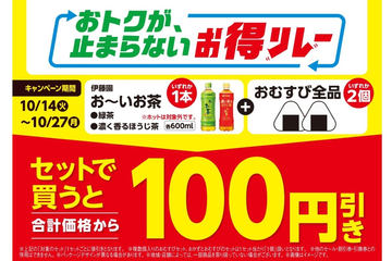 「ファミマのお得リレー」第7弾、おむすび2個と「お~いお茶」を一緒に買うと100円引き!