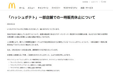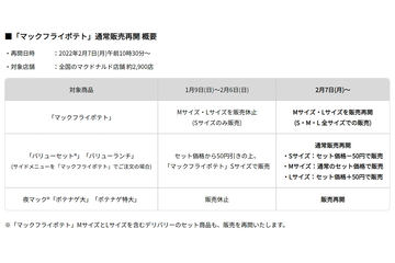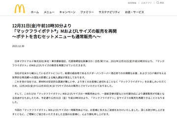 マクドナルド、12月31日10時30分からポテト全サイズの販売を再開