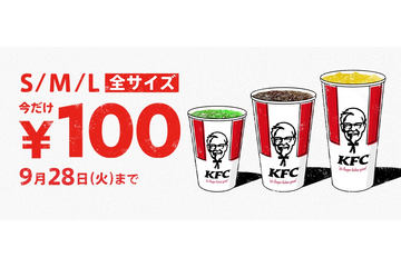 ケンタッキーフライドチキン、9月15日~28日は「ドリンク全サイズ100円」キャンペーン