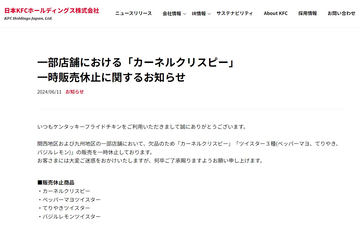 ケンタッキー「カーネルクリスピー」など一時販売休止。関西・九州の一部店舗にて