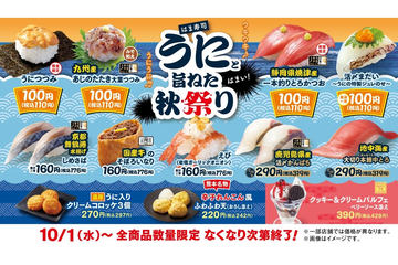 スシロー、「大切り本鮪中とろ」160円~、「濃厚うに包み」180円~