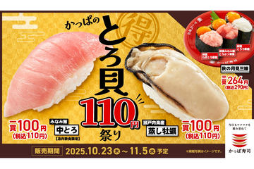 かっぱ寿司、みなみ鮪中とろ/瀬戸内海産 蒸し牡蠣が110円!「かっぱのとろ貝110円祭り」