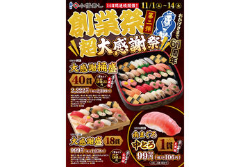 小僧寿し“40貫2399円”の「大感謝桶盛」など創業祭第2弾! 実施店舗リストも公開