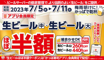 かっぱ寿司、アプリ会員なら何杯飲んでも「生ビール半額キャンペーン」
