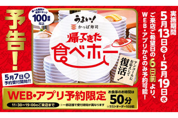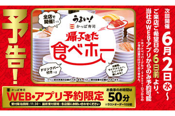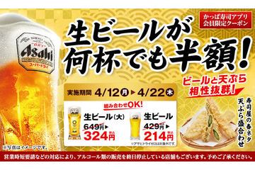 かっぱ寿司、無料アプリ会員限定で生ビール・ドリンクバー半額キャンペーン実施