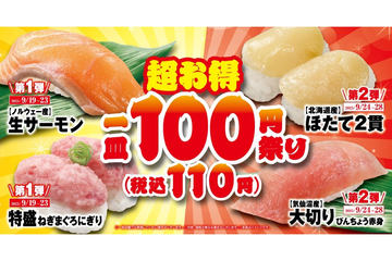 くら寿司、ノルウェー産生サーモン/ねぎまぐろにぎり/気仙沼産大切りびんちょう赤身/北海道産ほたてが期間限定で110円!