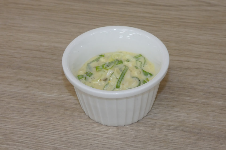 青山氏:海外の方はディップする文化があるので、何かつけようと考えて、ねぎタルタルを開発しました。こちらもたくさん試作したなかで勝ち残ったソースです。洋食屋で食べられるタルタルをイメージしています。青ネギはモスファームで栽培されたものを使用しています。