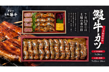 「カルビ大将」「味のがんこ炎/がんこ亭」(アトム)は、うなぎと牛カルビのどちらも楽しめて、付け合わせにチヂミが付いた「うなぎ牛カルビ重」を7月16日~8月4日に持ち帰り限定で販売する。価格は1590円。