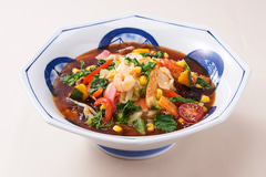 同社初となる酸辣湯スープを使用した商品。酸味と辛みをバランスよく合わせてあり最後まで美味しく食べることができる。通常のちゃんぽんでも使用している野菜に加え、赤パプリカやコーンなど彩り豊かな国産野菜のほか、カルシウム、β-カロテン、ビタミンCなどを多く含むケールも使用している。そのほか「彩り月見ちゃんぽん」「彩り月見皿うどん」は月をイメージした半熟卵をトッピングしている。