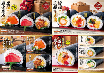 すし銚子丸(銚子丸)は、「恵方巻」を1月16日~2月3日に販売する。予約は店頭・電話・ネットで受付ける。2月3日の節分当日はかなりの混雑が予想されるため、前日までの早めの予約をすすめている。