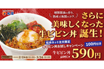 牛めし・カレー・定食・その他丼の「松屋」(松屋フーズ)は、新作「ネギ塩牛焼肉丼」と、懐かしの「キムチ牛めし」を9月19日15時に発売する。