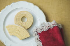 創業100年を超える老舗同士がコラボ。バターや卵など素材の力を活かした生地を職人が一層ずつていねいに焼いたバウムクーヘンと、レースでバウムクーヘンを表現して「ユーハイム」の文字をあしらったタオルハンカチがセットになって価格は4470円。ハンカチは「レッド」と「イエロー」の2色で、「イエロー」はオンラインショップ限定カラーになっている。