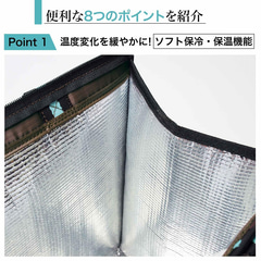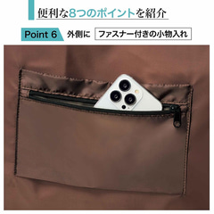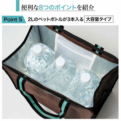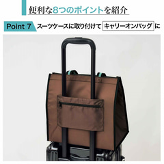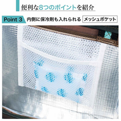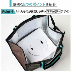 3~5号サイズのホールケーキが入るくらいのマチが広いデザインで、入れた物が安定しやすく、2Lのペットボトルが3本入る容量を備えている。外側にはファスナー付きの小物入れもあり、スマホなどを入れられる。小物入れはスーツケースのバーに通せるようになっているので、キャリーオンバッグとしても使える。