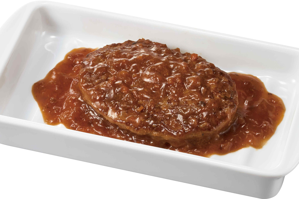 牛と豚の合い挽き肉を使ったジューシーで食べ応えのあるハンバーグを、ワインや香味野菜入りの香り高いソースで煮込み、すき家の「カレー」に合わせたメニューメニュー。すき家のカレーおなじみ、別添えの「すき家の特製辛口ソース」で辛さを自由自在に調整でき、唐辛子や胡椒がきいたスパイシーな味わいへの変化も楽しむことができる。