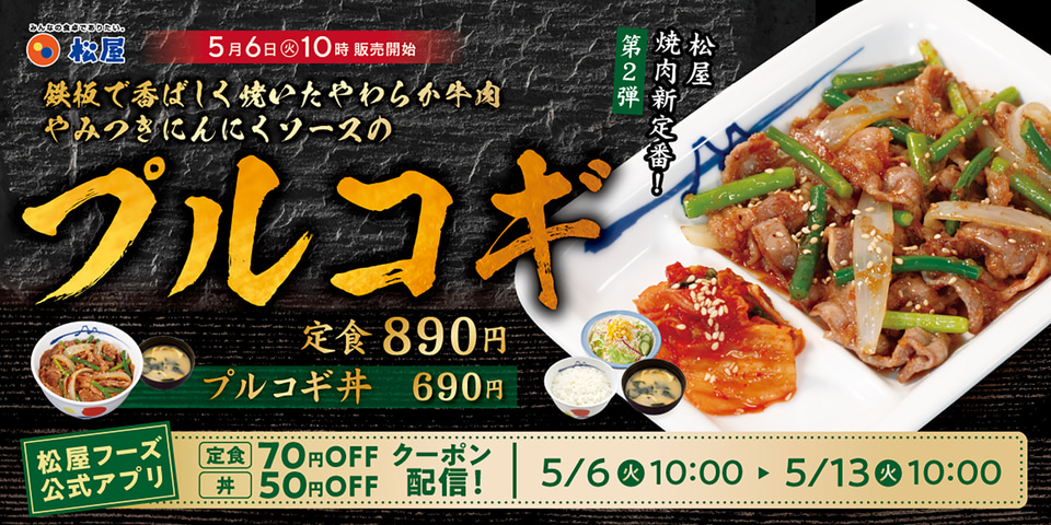 発売から5月13日10時までは「プルコギ丼」が50円引き、「プルコギ定食」が70円引きになるモバイルクーポンを用意している。