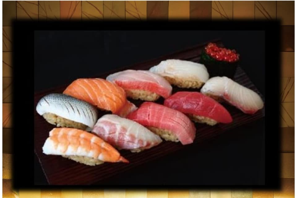 内容: やま幸本マグロ赤身、やま幸本マグロ中トロ、サーモン、金目鯛、真鯛、平目、かんぱち、蒸し海老、小肌、いくら