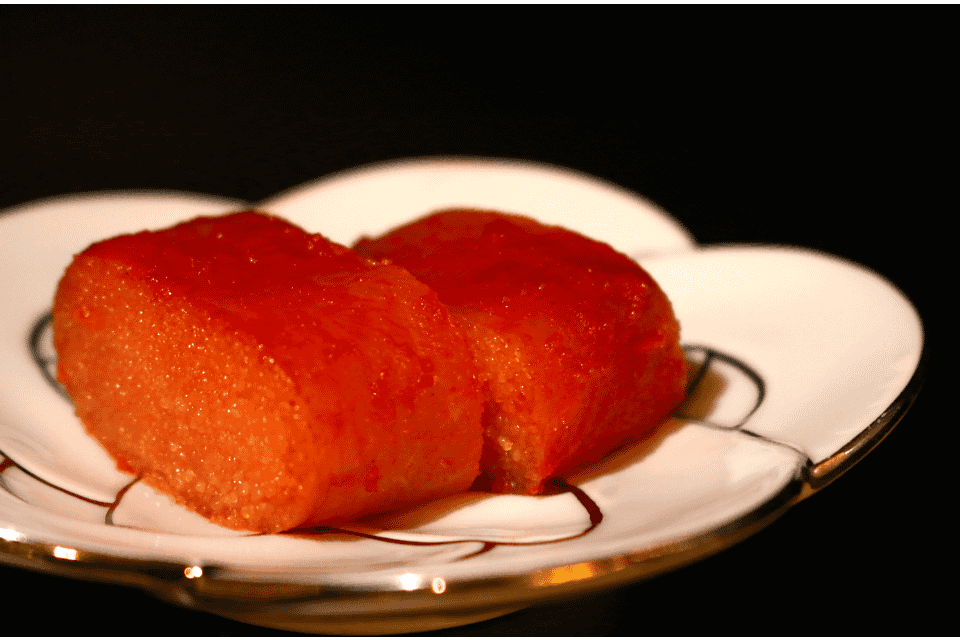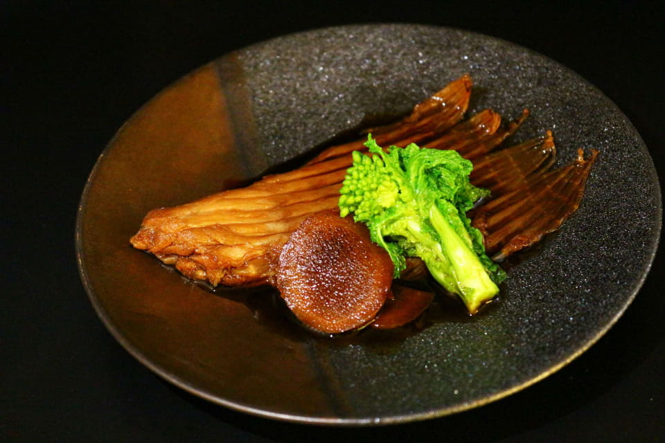「鮨 銀座おのでら 息子 梅田店」で人気のサイドオーダーメニュー。北海道ならではの食材「カスベ(エイのヒレ)」を使用し、軟骨のコリコリとした歯ごたえと、煮込むことで生まれる身の周りのぷるぷるとしたゼラチン質の独特な食感が特徴となっている。じっくり甘辛く煮込み、濃厚な旨味が芯まで染み込んだ味わいは、ご飯やお酒との相性もよいという。