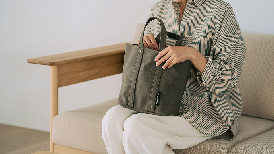 季節を選ばずに普段使いできるコットン素材のバッグで、LサイズとSサイズを用意。シンプルで飽きのこないデザインで、真鍮の鋲とロゴ入りのタグ、3つのポケットとマグネットボタンを備え、中身も見やすく、財布や鍵など取り出しやすくなっている。
