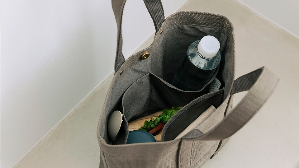 ワインボトルも縦に入る高さで、たっぷり容量のLサイズは、シーンに応じて使い分けられるダブルハンドル。お買いものにもちろん、ビジネスや通学にも活用できる。