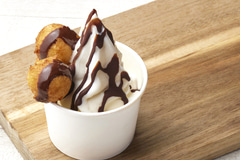 「丸亀うどーなつ もっちもち満喫セット」で用意されているトッピングは、きなこ/あんこ/チョコスプレー/プチプリン/ホイップクリーム/カスタードクリーム/バニラアイス/チョコアイス/抹茶アイス/スライスアーモンド/フルーツミックスの11種類。ソースは、くろみつ/チョコソース/いちごソース/マンゴーソースの4種類から選べる。