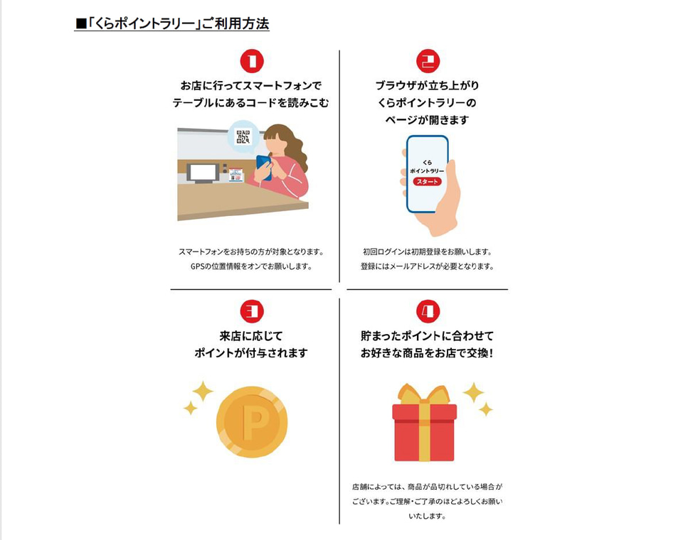 国内全店舗のテーブルに設置された二次元バーコードをスマートフォンで読み取ることでポイントが付与され、貯めたポイント数に応じて、用意した賞品と交換できる。