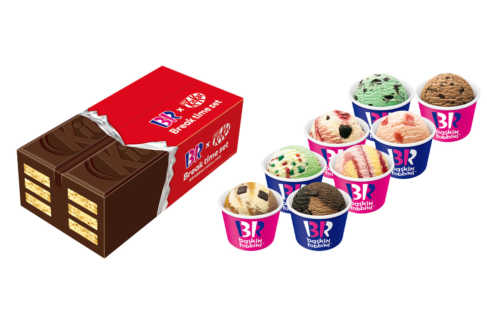 「ブレイクタイムセット」は新作コラボフレーバー「ソルティ キャラメル ブレイク」か「トリプル チョコレート ブレイク」1個以上と好きなアイスクリーム(スモールorレギュラー)を計8個選んで持ち帰れるバラエティボックスで、キャンペーン期間中は「キットカット」がそのまま大きくなったような数量限定デザインボックスで提供する。