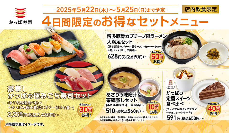 かっぱ寿司(カッパ・クリエイト)は、店内飲食で最大50円引きになるセットメニューを5月22日~25日に販売する。