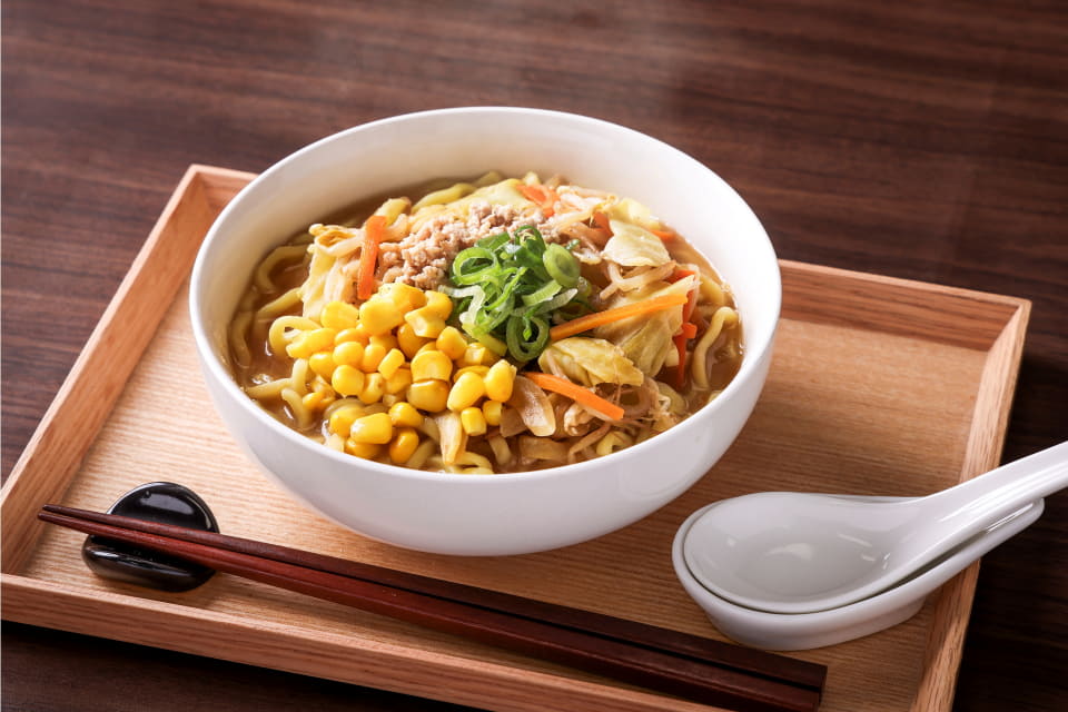 そこに味噌ラーメンに合う挽肉炒めと野菜炒めをトッピング。玉ねぎ、もやし、キャベツ、人参の野菜炒めは、前回より増量。さらに、味噌ラーメンのトッピングには欠かせないコーンと青ねぎも盛り付けられ、見た目や食感に彩りとアクセントを加えている。