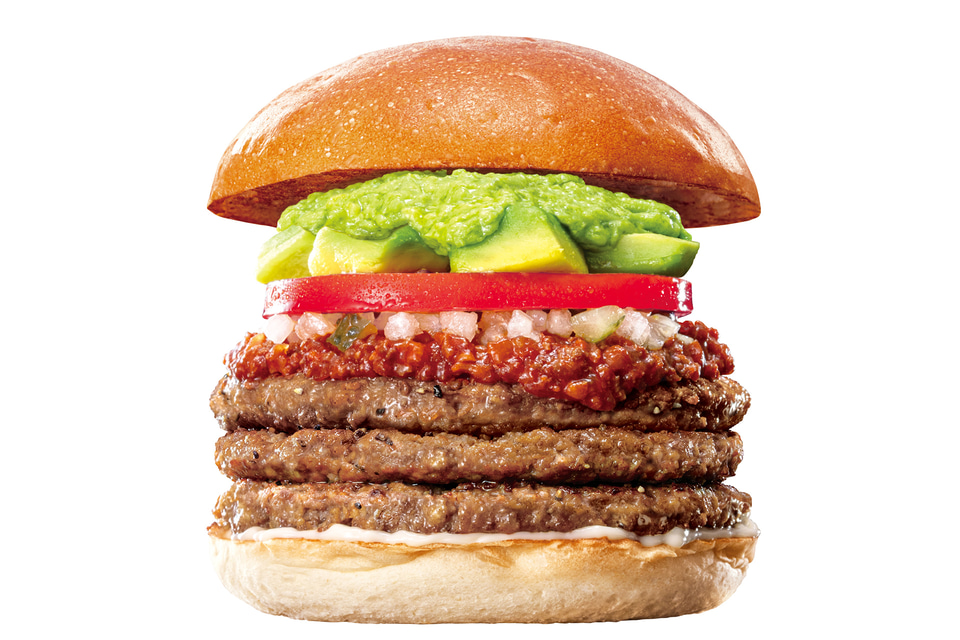 牛肉100%パティを贅沢に3枚重ね、食べ応えのある大きさにカットしたアボカドと、メキシコ産アボカドを使用したなめらかな食感のワカモレソース、スパイシーなチリミートソースやスライストマトなどをふんわりもっちり食感のバンズで挟んだ。