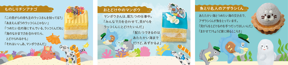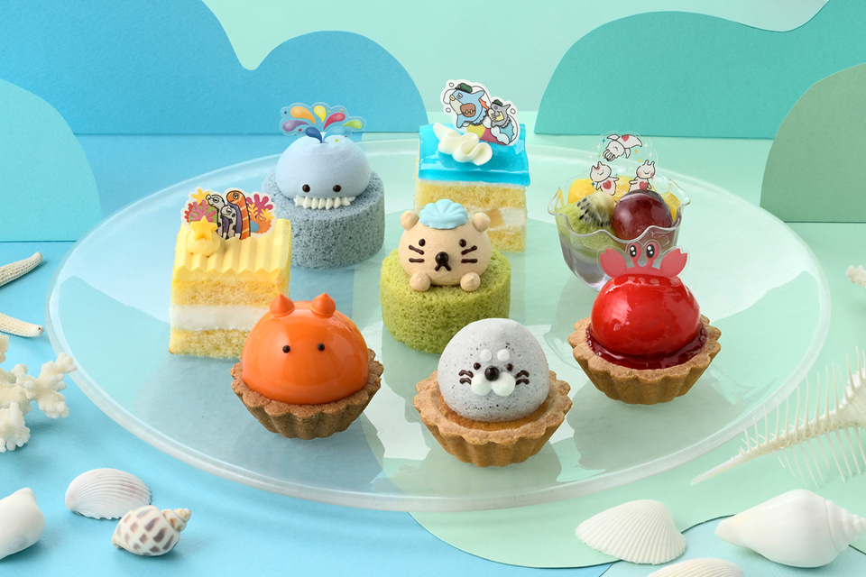 メンダコやアザラシなど、人気の海の生き物をモチーフにしており、スイカやソーダ風味、マンゴーやブドウなどの味の夏らしいケーキ。大切にしている貝がらをなくして探しに出かけるラッコくんと、貝がらを拾った海の仲間たちがラッコくんに届けようと力を合わせるストーリー仕立てになっている。店頭での予約を受け付けており、Webでは5月26日10時~6月21日に受け付ける。