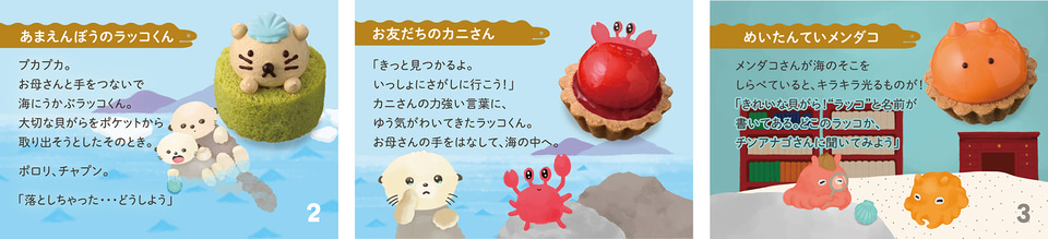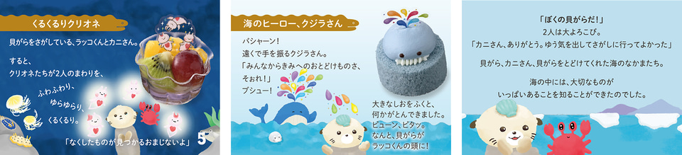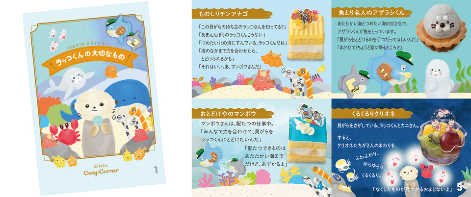 絵本を読むように楽しめるプチケーキのアソート“ケーキがつむぐものがたり”シリーズで、「ラッコくんの大切なもの」の物語を絵本風にしたリーフレット付き。