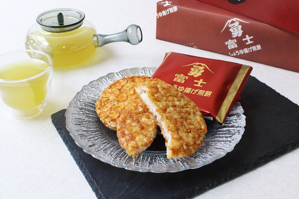 岩手県釜石市の藤勇醸造が製造する「富士醤油」を使用し、甘じょっぱい味と芳醇な香りが特長という醤油揚げ煎餅。1枚食べたらもう1枚食べたくなる美味しさで、贈り物としても最適という。