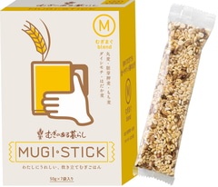 MUGISTICKは、厳選した麦を100%使用したオリジナルのむぎスティック。白米と比べて糖質が約39%オフで、食物繊維も補えるという。「むぎまぐブレンド」「ぷちぷちブレンド」「はとむぎブレンド」の3種を用意。