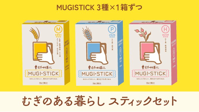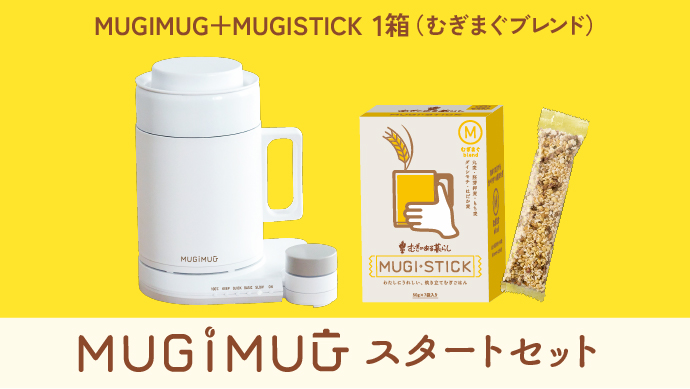 セット内容: MUGIMUG 1台、MUGISTICK むぎまぐブレンド・MUGISTICK ぷちぷちブレンド・MUGISTICK はとむぎブレンド各1箱(50g×7本)