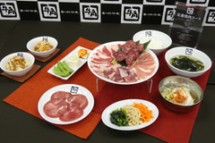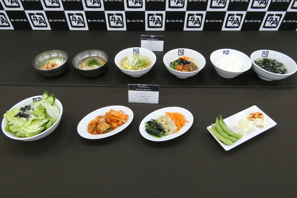 おつまみは、キムチの2種盛り合わせ、チョレギサラダハーフ、ナムルの3種盛り合わせ、おつまみ3点盛り(枝豆、ネギ塩やっこ、旨辛ポテトサラダ)の4種類、〆モノは、牛角冷麺ハーフ、梅しそ冷麺ハーフ、ごまねぎ塩ラーメンハーフ、たっぷりお野菜のミニビビンバ、ごはんわかめスープ(小)セットの5種類から選べる。