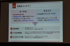 続いて登壇した戸田氏は、新セットのコンセプトについて説明。食べ放題と単品注文の2つの注文方法があるが、食べ放題は固定価格の安心感があるものの、価格設定が高く、頻繁に利用できない、価格に見合った量が食べられない側面もある。単品注文は、お腹いっぱいのときの合計金額が分からない不安感やちょうどいい量の目安が分からないという課題がある。