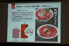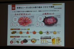 同氏は、このほかにも4月から提供している大皿メニューがオススメの商品が分かりやすいとして好調に推移していることや、平日にアプリ会員限定で提供している「カルビMIXセット」(1958円)や「上焼肉セット」(2728円)といった“ひとり焼肉”向けのセットが人気で、8割以上が854円の追加で生ビールが60分飲み放題になるプランと合わせて利用していることなどを紹介。さまざまな牛角の利用方法があることをアピールしていた。