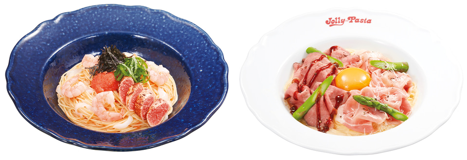 ジョリーパスタは、「“冷製カッペリーニ” 炙り明太子とヤリイカ・エビの明太子ソース」「“冷製カッペリーニ” ローストビーフと熟成生ハムの冷製カルボナーラ」を6月5日に発売する。