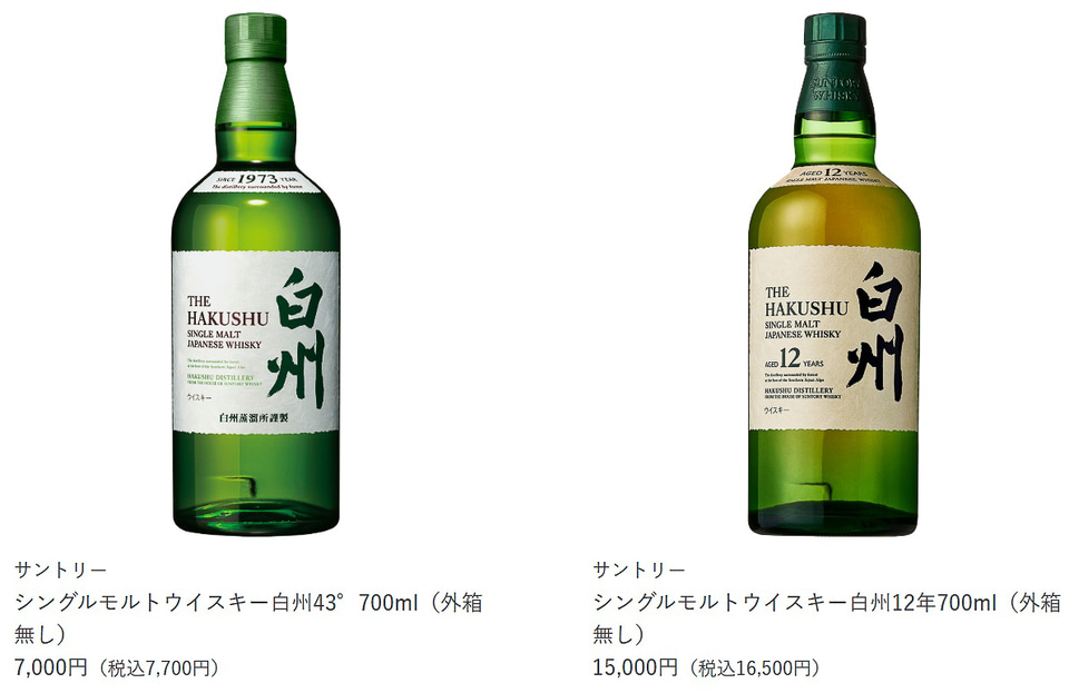 ・「シングルモルトウイスキー白州43°700ml(外箱無し)」(7700円)
