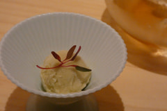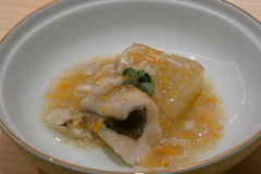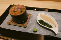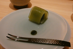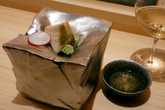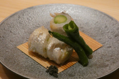霧翠という店名は、鶴見岳や由布岳といった山々と別府湾が生み出す霧と、竹細工や木々の緑を意味する翠に由来する。竹や石などの自然素材に囲まれたカウンター8席、個室1室(6席)の落ち着いた空間で、江戸前ならぬ“豊後前”の鮨を会席スタイルで楽しめるが、ポイントになるのはアルコールとのペアリング。地元の蔵元の日本酒や選び抜かれたワインが料理にあわせてサーブされる。